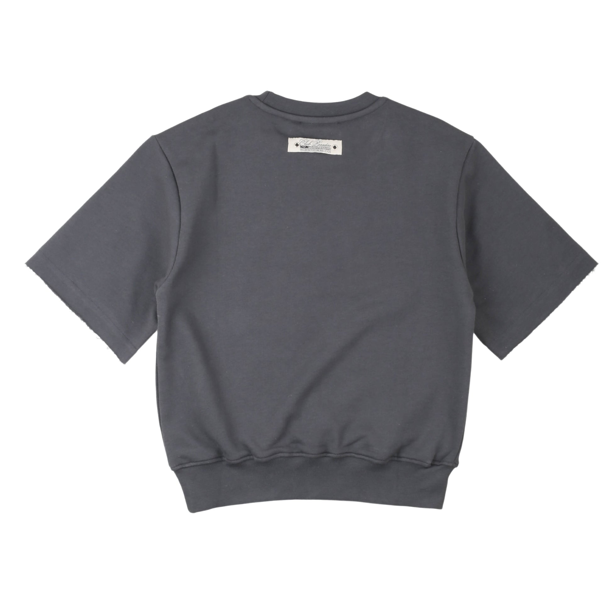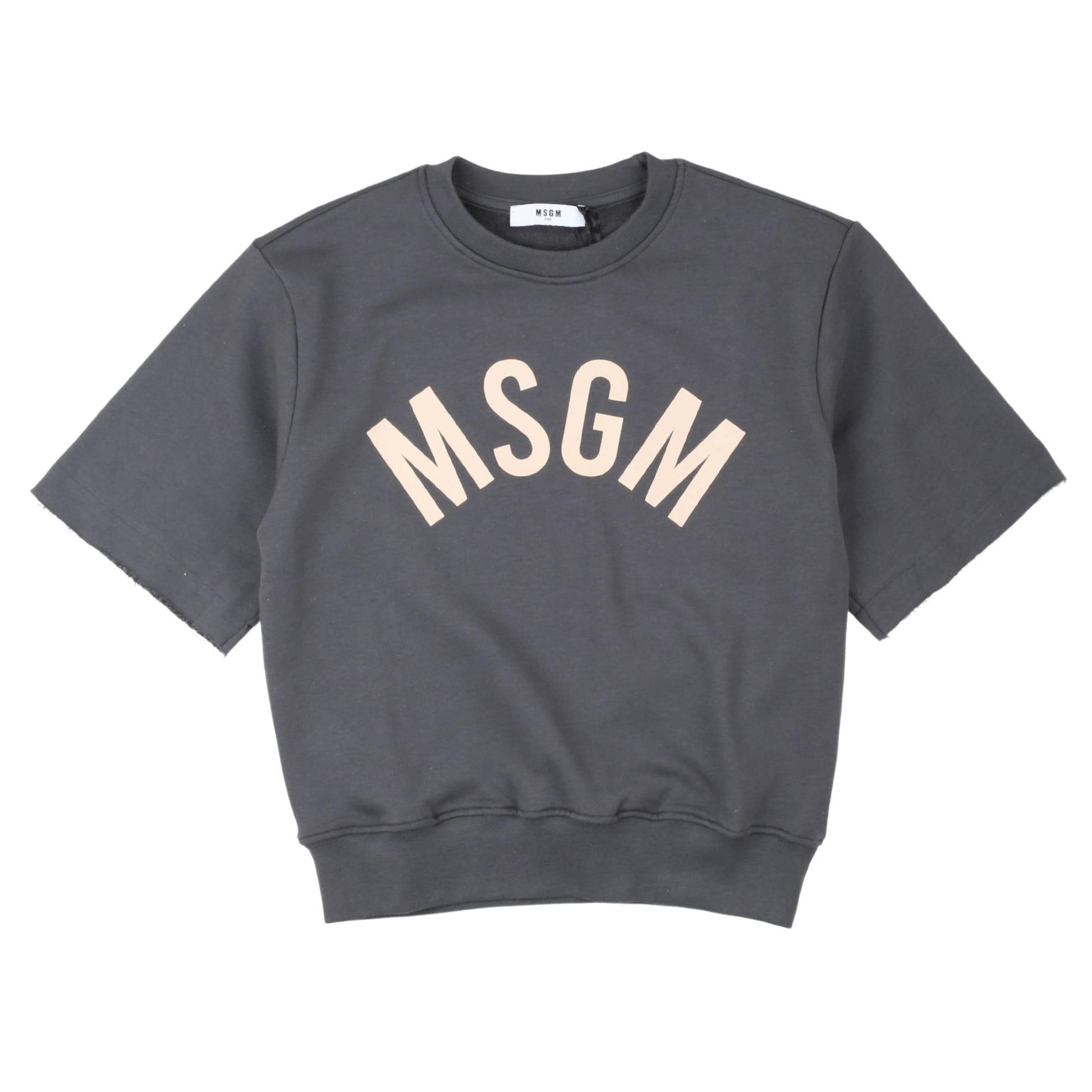 Felpa Msgm ragazzo, color grigio piombo, manica corta, con logo color oro stampato nella parte centrale della maglia e piccolo logo stampato sulla parte posteriore alta, 100% cotone, taglia 12 anni.