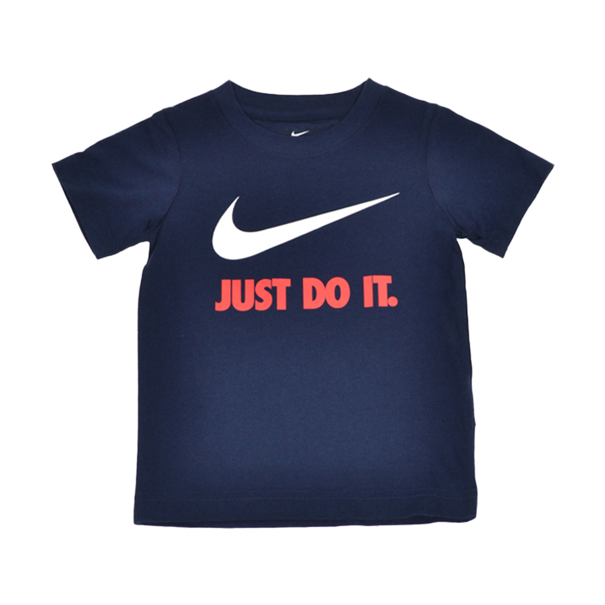 T-shirt unisex blu Nike, a girocollo, con logo stampato rosso e bianco centrale, 100% cotone, taglia 3 anni.