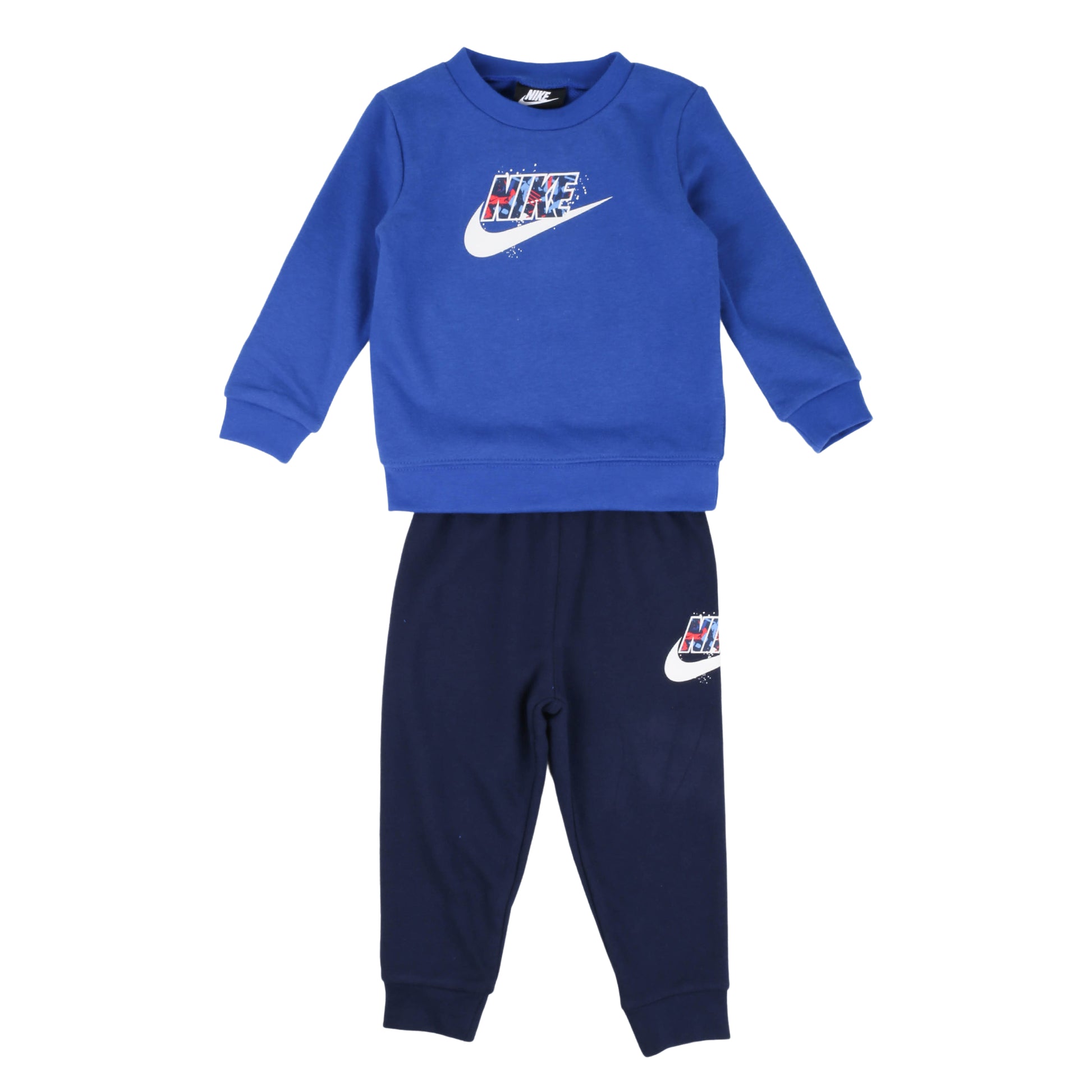 Tuta Nike blu bambino, felpa a girocollo con logo stampato centrale e maniche con polsino, pantalone blu scuro con logo stampato sulla parte alta sinistra, elastico in vita e polsino in fondo al pantalone, 60% cotone, 40% poliestere, taglia 18 mesi.