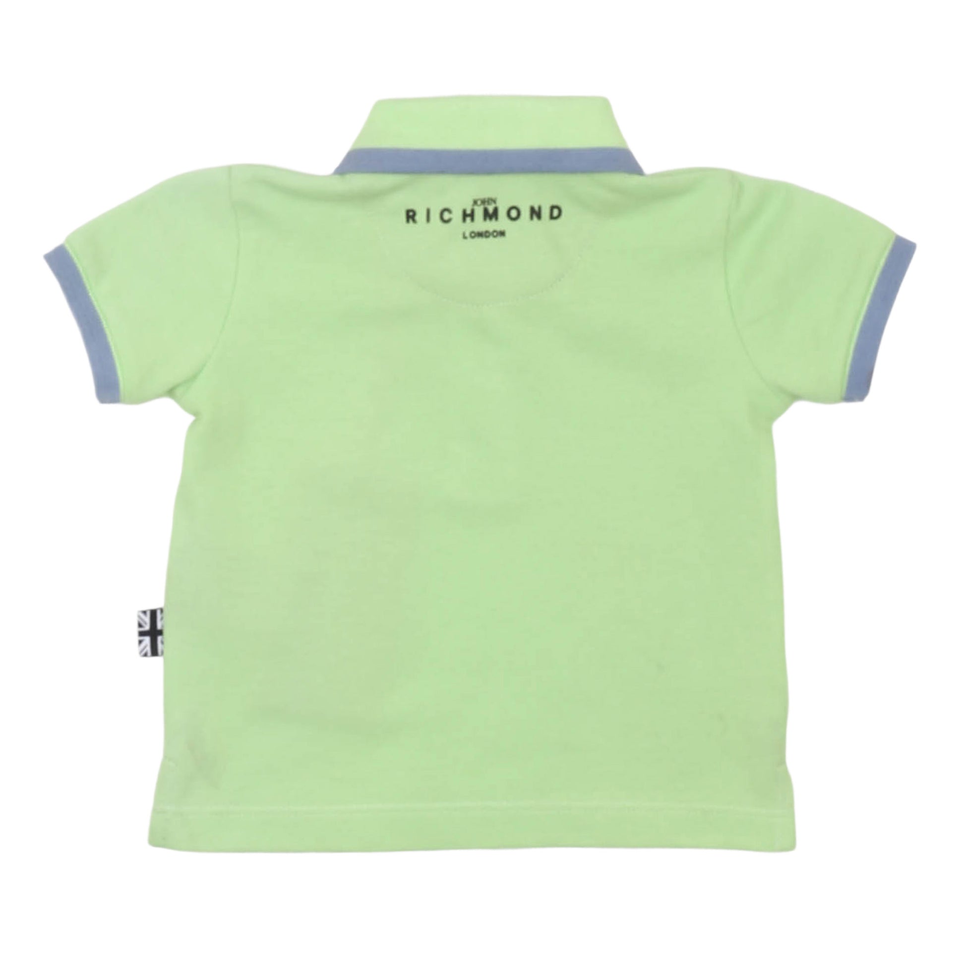 T-shirt polo manica corta verde, bimbo, John Richmond, con colletto in tinta e due bottoni, logo stampato sulla parte alta sinistra e piccolo logo stampato sulla parte alta posteriore, 100 cotone, taglia 36 mesi.